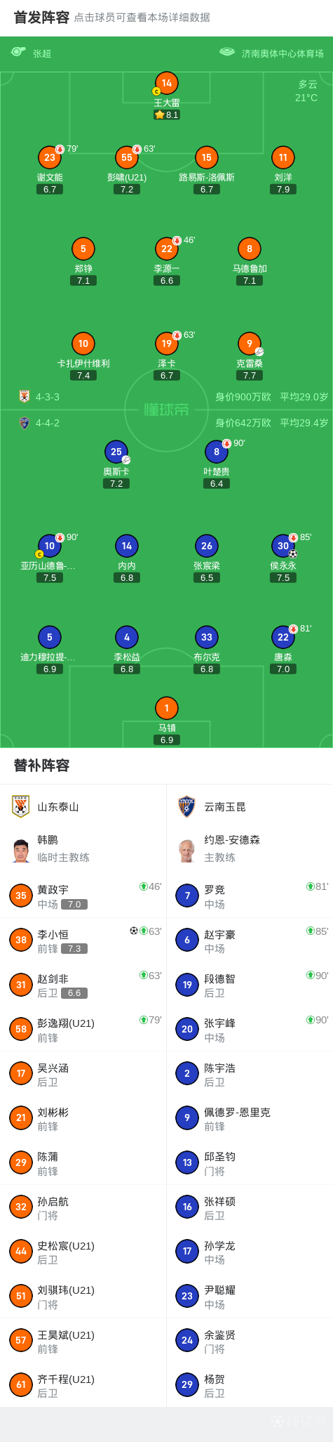 北京时间10月4号晚上,中超联赛第26轮踢得火热,山东泰山在主场迎战云南玉昆。上半场李源一制造险情,王大雷多次精彩扑救,侯永永头球破门,下半场奥斯卡错失单刀机会,李小恒头球扳平,郑铮射门打中门框。最后双方1比1握手言和。